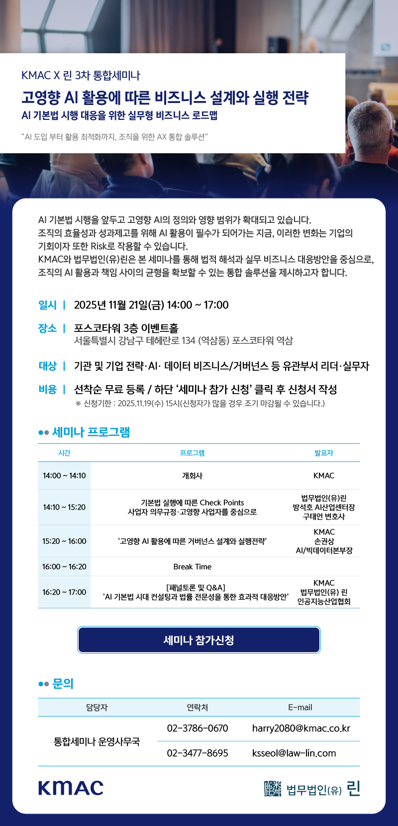 - 한사회 행사 및 세미나 관련 문의 : event@kica.bar
