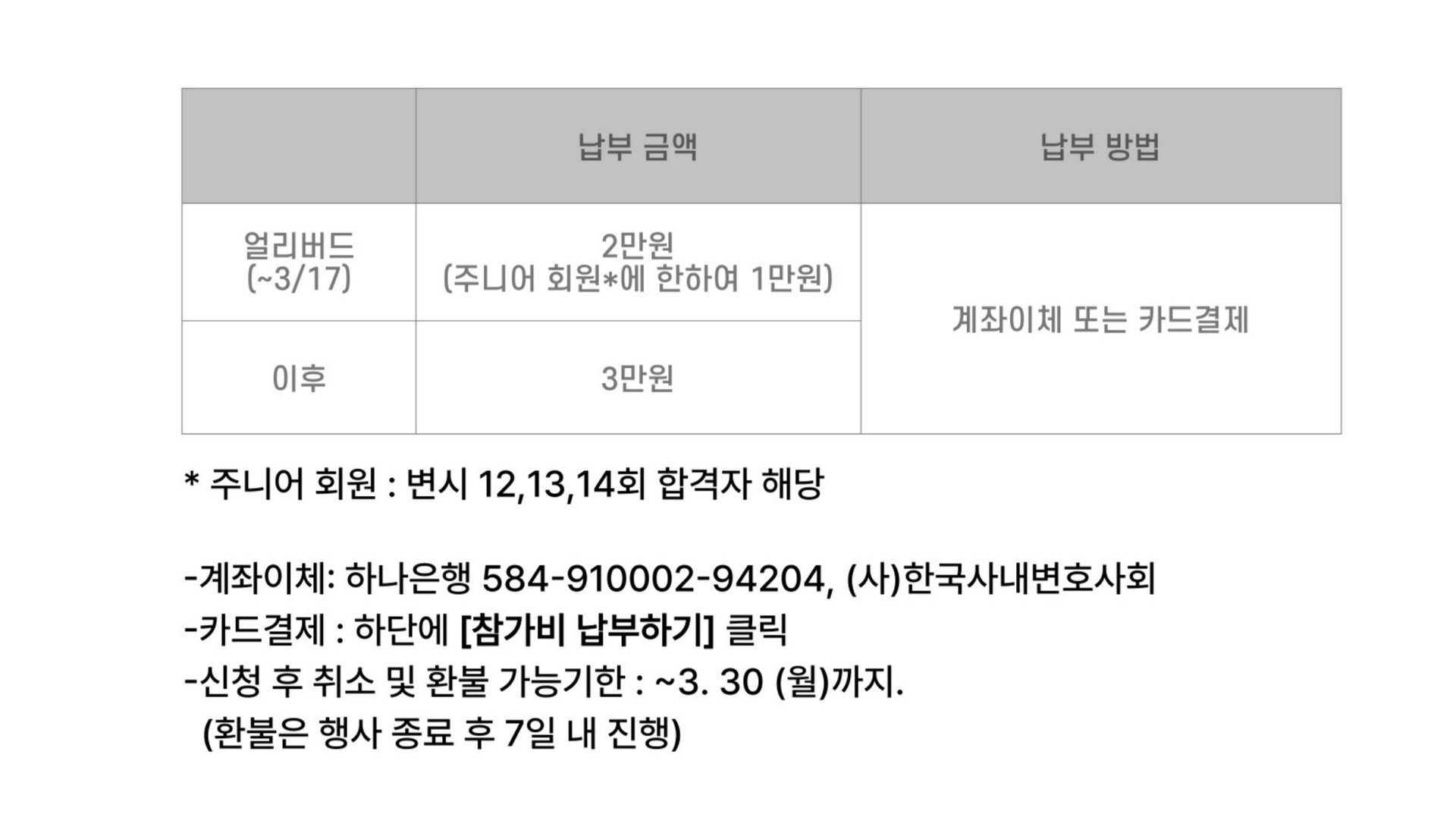 - 한사회 가입 및 외부 홍보 관련 문의 : admin@kica.bar